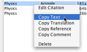 For individual citations, TextCite offers you various options. The most common function is exporting the text of a citation, along with its bibliographic reference. This function is accessed by right-clicking on the citation in the table, and selecting "Copy text". The text will be copied to the system clipboard, so you can paste it into the text document you currently have open.