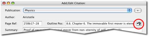In order to use an outline that you have created for a publication, you can assign a place in the outline to each citation record for that publication. To assign a site in the outline to a citation, click on the button with an image of binoculars, at the right side of the "virtual notecard" screen: