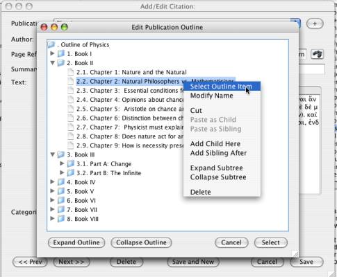 When you click this button, the outline window will open. Here you can find the place in the outline that you want to assign the citation to. You can assign the outline node by double-clicking on it, or by right-clicking and choosing "Select".