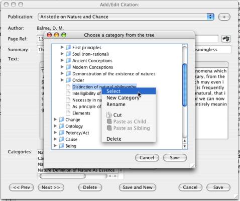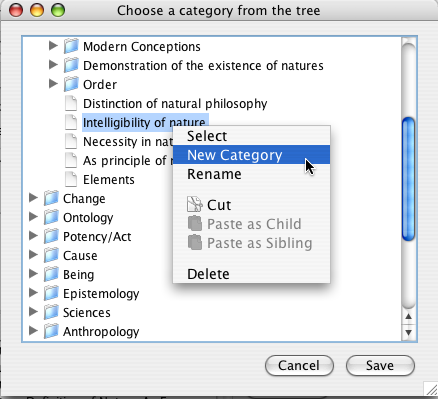 You can also create new categories from the window that you use to assign them. Instead of choosing the option "Select" from the context menu, choose the "New Category" option. Once you have added the new category, you can select it normally to have it added to the citation record.
