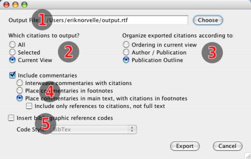 If you want to include your own commentaries along with the exported text, you can include how you want them to be included. You can intersperse your commentaries in the body of the exported document, below the text they are commenting, or else you can place them in footnotes attached to each text. A final option is to place the commentaries in the body of the text, and include the corresponding citations in footnotes. If you place the citations in the footnotes, you can choose to save space by simply including a reference to the text, instead of the entire citation.