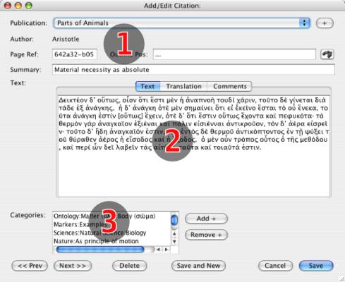 The contents of the citation. Note that there are three tabs: you can introduce the original text in the first tab, a translation in the second, and a commentary (if desired) in the third. All of this information will be saved with the notecard, and can be exported later.